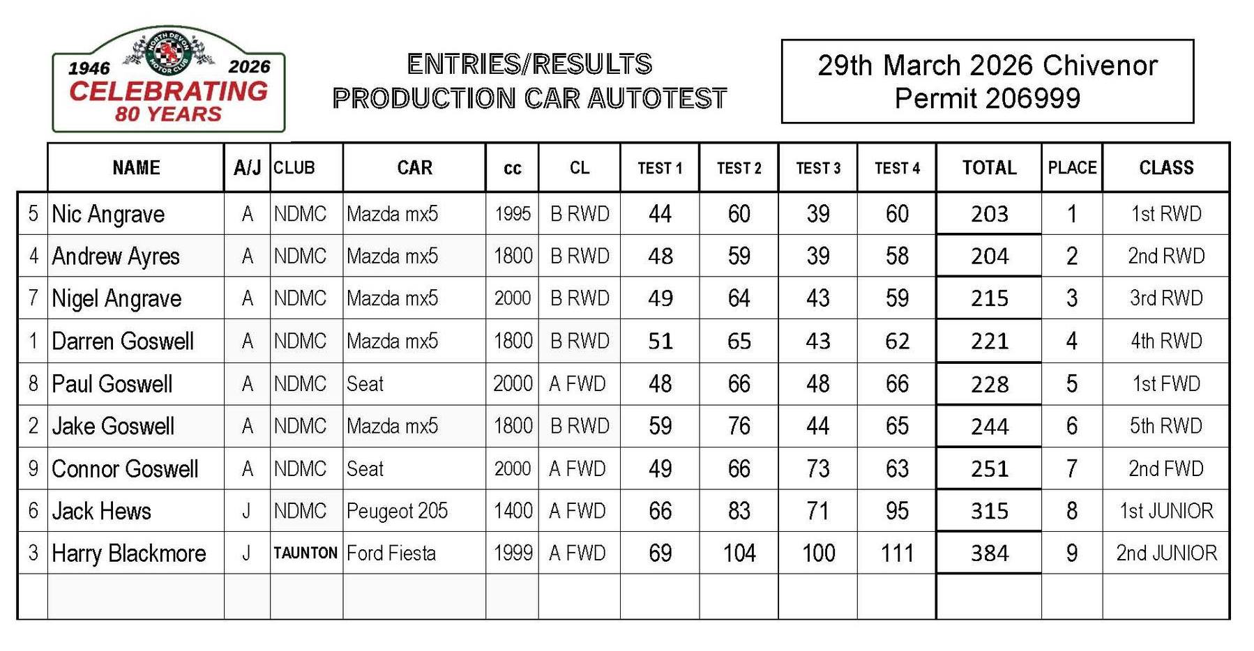 29th March - Production Car Autotest at Chivenor. RESULTS