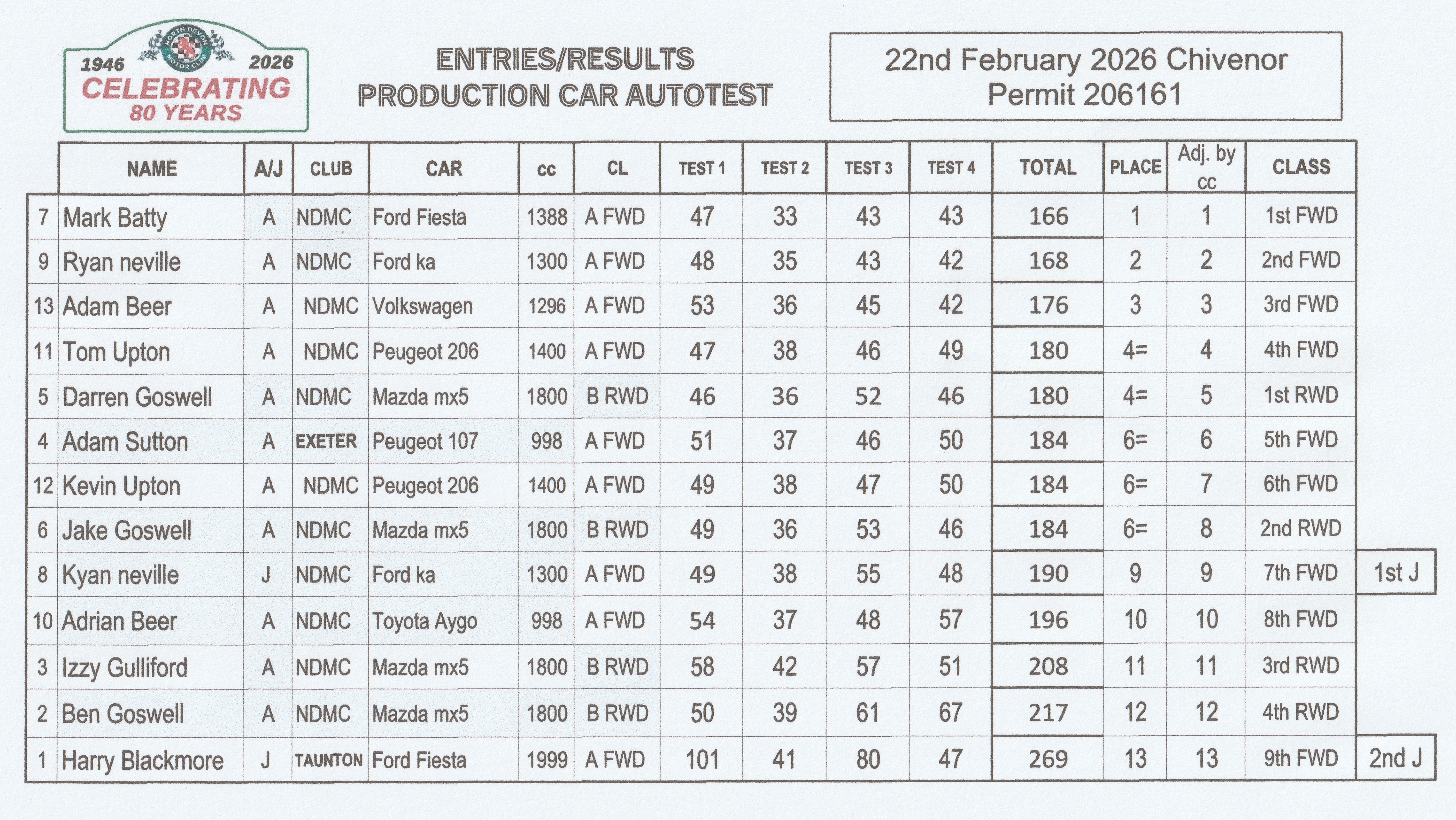 22nd February - Production Car Autotest at Chivenor. RESULTS